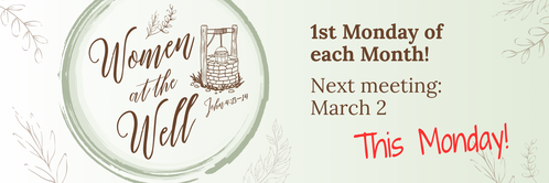 Women at the Well meets this Monday, March 2! This ministry is open to all ladies of IBC, as well as any guests you'd like to bring along. Light refreshments will be served. Please register for each monthly meeting- thank you!